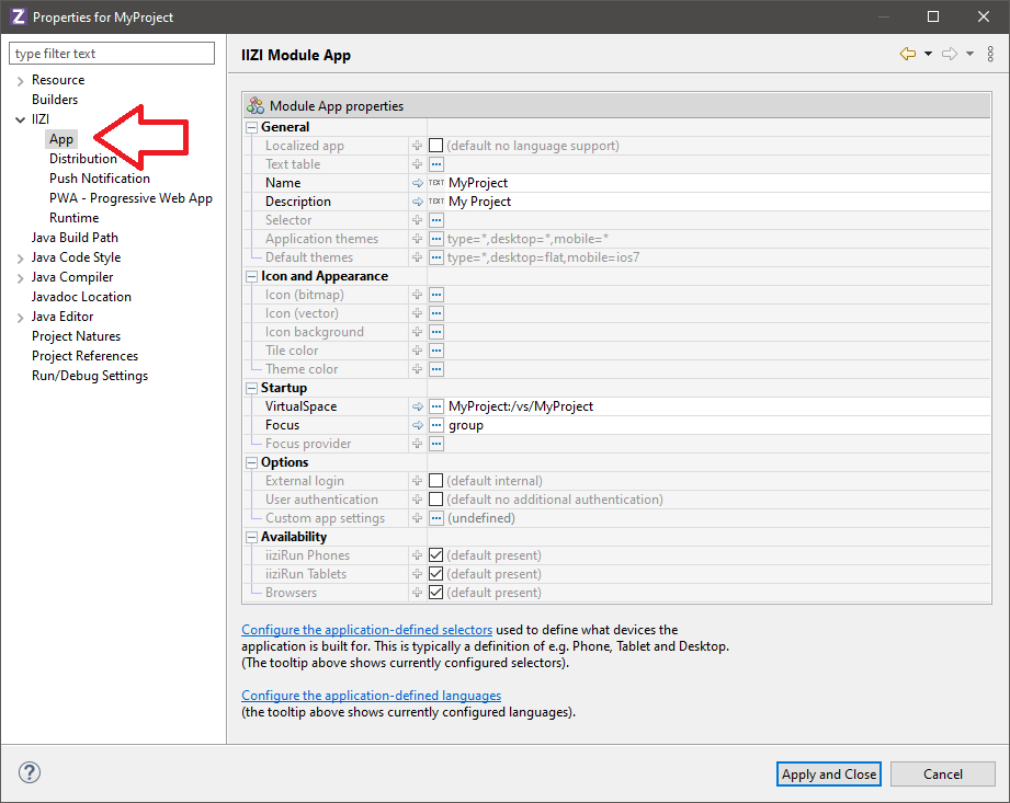 your project and choose Properties > IIZI > App to find iiziApp Application Properties.