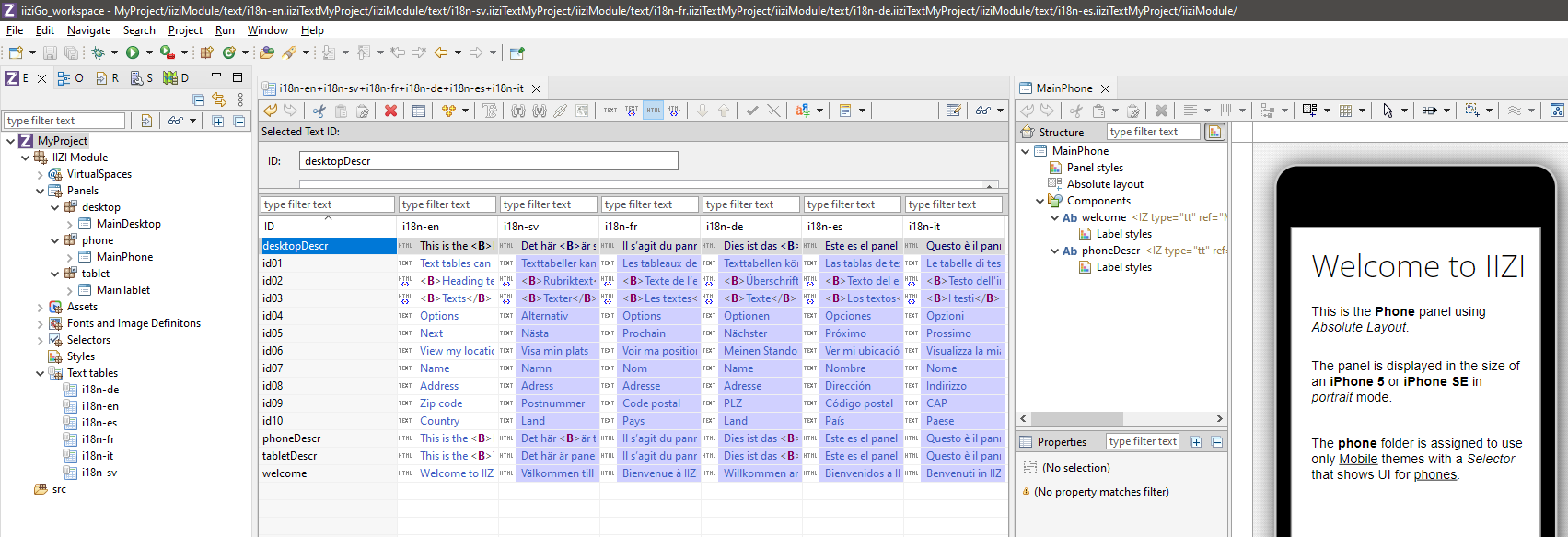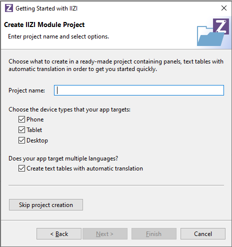 Project name.Phone, Tablet, Desktop.Create text tables with automatic translation.typing in the language code or by filtering the languages and click Add. The first language specified is the base language, i.e. the language you intend to use when you develop the application. When you use automatic translation, English (en) is recommended as Google Translate or Microsoft Azure Cognitive Service to translation gives the best result as it translates accurately. See Automatic text table translation for more information.Finish and you’re ready to go!Project Manager and choose New > Project.IIZI, choose to create a new IIZI Module Project (Quickstart).