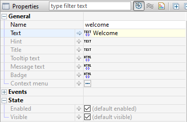 Although property sets are different depending on the component selected, the following properties exist for all components: Name, Title, Tooltip text, and the boolean states: Enabled and Visible.