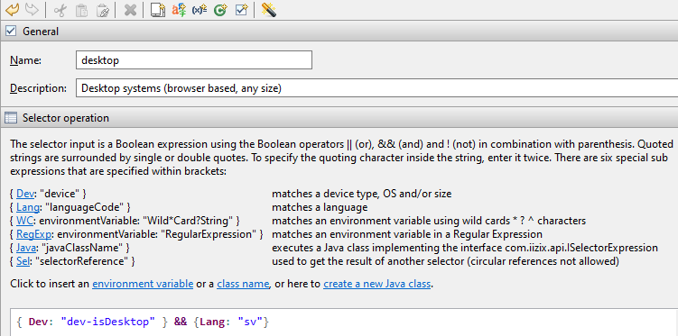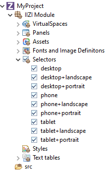 A Selector is a short expression that allows your application to easily identify devices; these IIZI Selector Expressions are kept in your project’s Selectors folder. Comparable to CSS media queries, your Selectors handle device change, device capability, and much more. You define a Selector and then apply it – in your applications Project view – to either the Module project, a package, or directly to a Panel. Having created your project with Quickstart, several Selectors have been written for you and stored in your project’s Selectors folder.