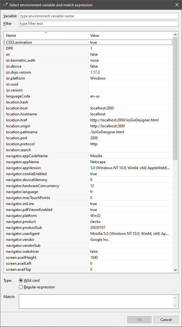 You may enter any environment variable that the devices may have, but the prompted list in the dialog box will show the last connected device’s environment, or the Eclipse internal browser’s.