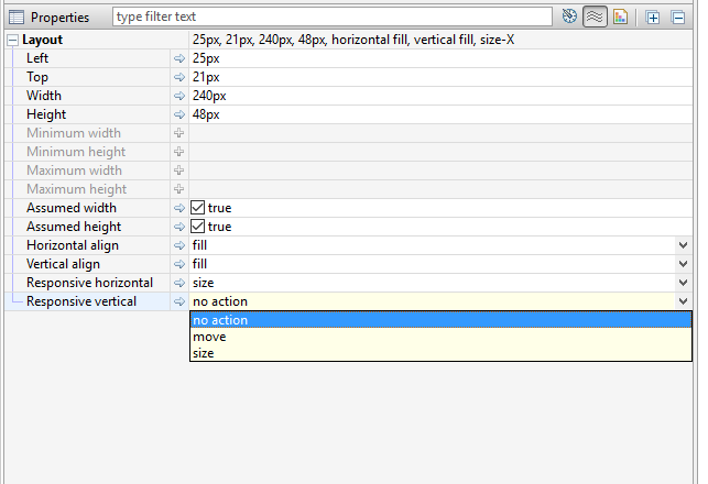 Finding the best UI experience on mobile and desktop, in both portrait and landscape and across all mobile devices is an art. All Layout Managers offer ways to achieved responsive design. The iiziGo design workbench offers Responsive horizontal and Responsive vertical properties of components when placed in the Absolute Layout. This feature allows a component to be assigned a different size or position when the device orientation is changed.