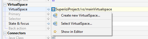 To connect the UI components to VirtualSpace entities, the Panel must first be connected to a VirtualSpace. In this way, you will connect UI components that handle data to a VirtualSpace entity. UI components which handle actions, such as buttons, are likely to have a vsAction property.