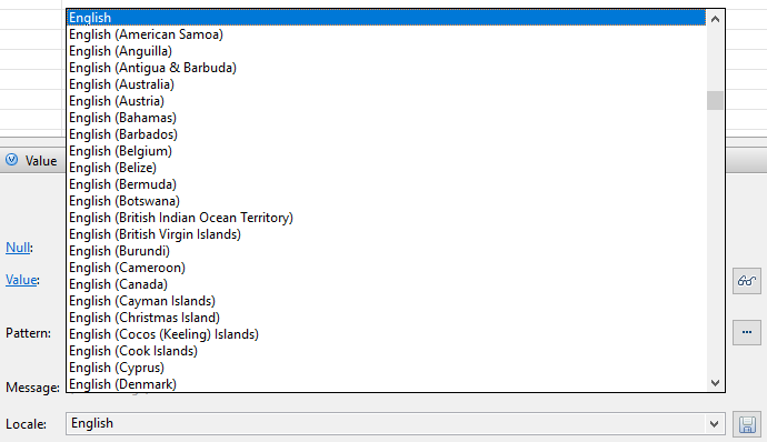 - Locale: combobox used for testing purposes to see how a value would look like in a specific locale. The tooltip of the Value entry field shows a preview of the value with the pattern in the specified locale; you can also toggle the preview to always be shown.